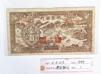 1945年4月1日,浙東銀行在浙江余姚成立,發(fā)行了18種36式浙東銀行幣。浙東銀行紙幣每元折合大米一市斤,不會貶值,在浙東人民群眾中享有很高的信譽。