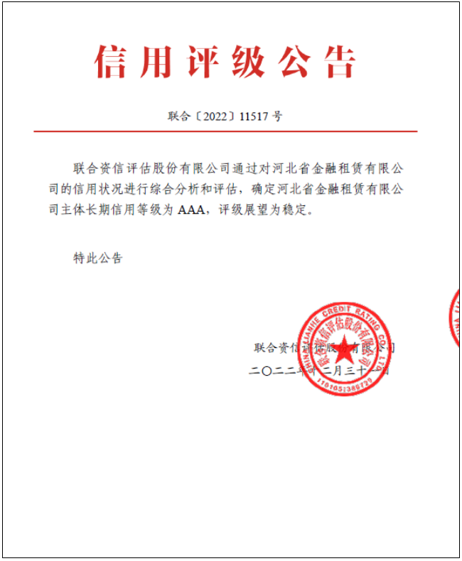 微信圖片_20230110194837.png       雙AAA!日前,河北省金融租賃有限公司正式獲得聯(lián)合資信評(píng)估股份有限公司AAA主體長(zhǎng)期信用等級(jí),加上此前持有的中誠(chéng)信國(guó)際信用評(píng)級(jí)有限公司AAA主體長(zhǎng)期信用等級(jí),成為首家獲得雙AAA主體信用等級(jí)的金租公司,為自身持續(xù)優(yōu)化融資結(jié)構(gòu)、拓展融資渠道、提升信用形象奠定了基礎(chǔ)。